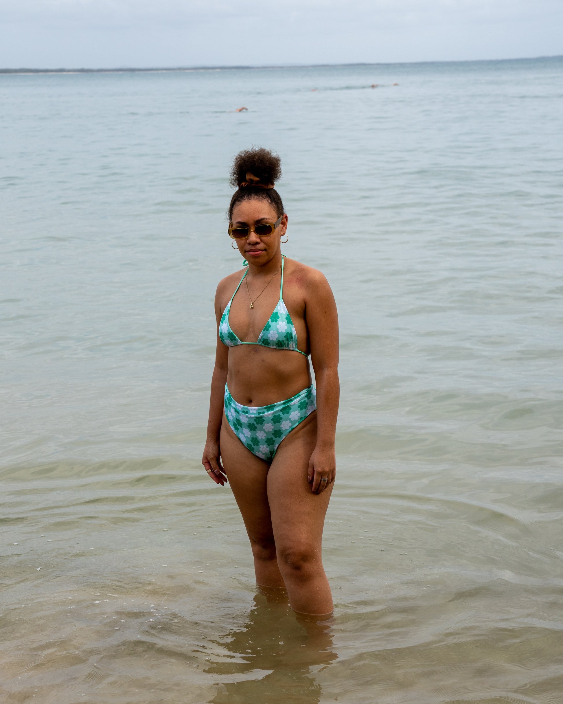 Flower Power: Turn heads in this eye catching print featuring crisp white and dark green retro flowers on a refreshing mint back drop. Reversible to mint green to invigorate your Summer days.